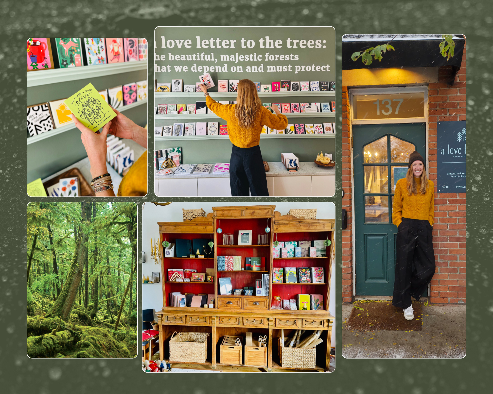 Our home is surrounded by forest in the Gatineau Hills. There is no place on Earth I’d rather be than running in the trees with my dog. Forests are deeply important to me and my family. I feel very privileged to live where we do, with access to nature, the river. It brings me so much joy. After many years of climate and conservation work, I was craving a more creative way to make an impact. Having this space, connected with community, is a perfect fit for me. I walk into A Love Letter and I just smile, and folks walk in here, I see them do the same. It feels meaningful and concrete.